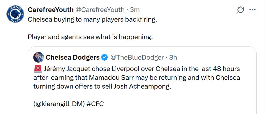 A friend of mine and popular Chelsea account on X, CarefreeYouth, posted this earlier today: