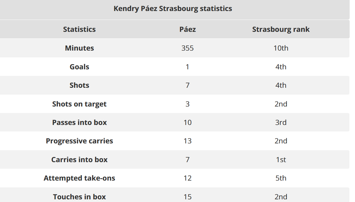 ‘As the table documents, it is early in both Páez career in general but also his time at Stade de la Meinau, how ever long that may be, but he is already having an impact for les Bleu et Blanc.